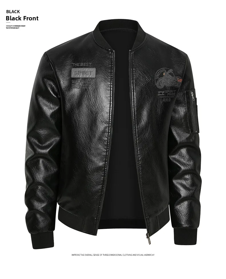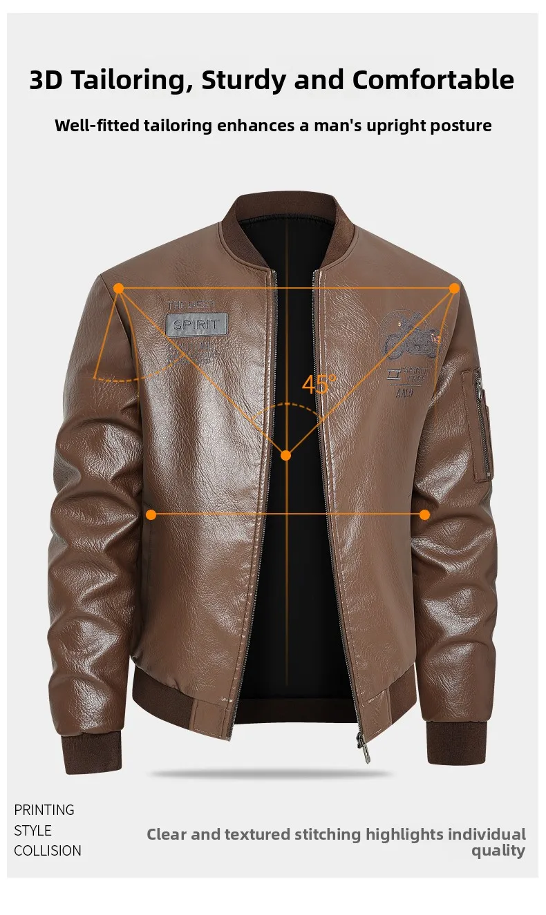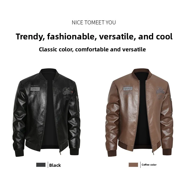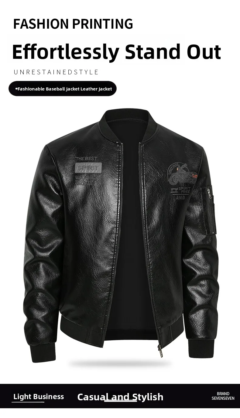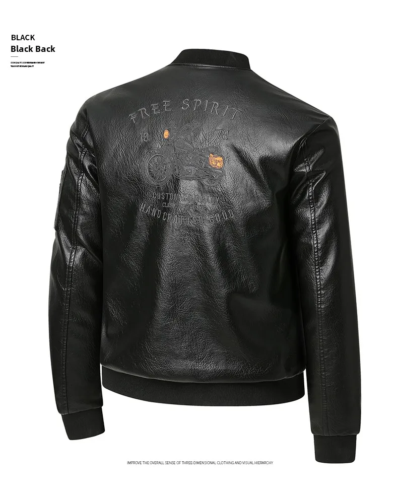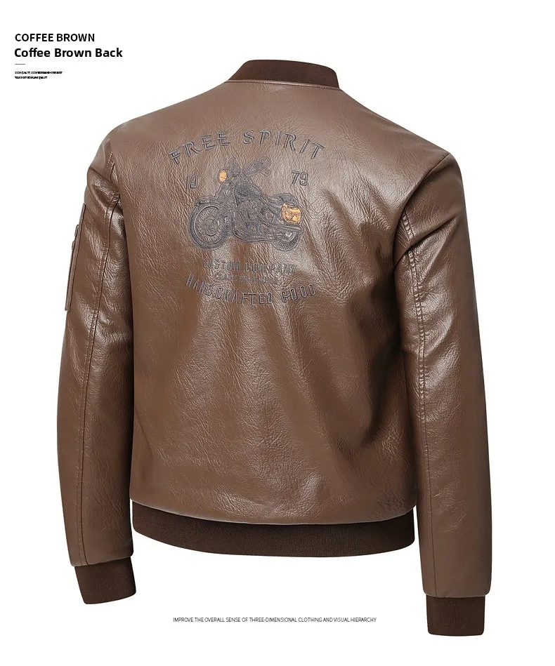 Men's Genuine Leather Jaet Baseball Collar Fce Lined Loose Casual Sli Motorcycle Jaet Embroidered Biker Coat
